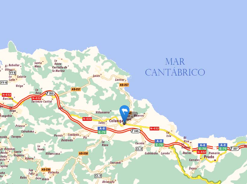 Nuestro hotel se encuentra situado en el centro de la villa de Colunga, capital del concejo. Su enclave está perfectamente comunicado, dada la cercanía de la Autovía A-8, pudiendo acceder perfectamente al hotel, tanto si lo hace desde la dirección Santander-Oviedo tomando la salida de Colunga (km. 345) y atravesando la Villa de Colunga o desde la dirección contraria Oviedo-Santander tomando la salida de Venta del Pobre (Km. 353) y recorriendo la carretera N-632 hacia Colunga.